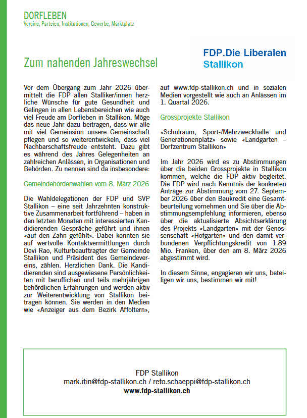 7. Nov. - «FDP Stallikon nominiert Kandidierende für Gemeindebehördenwahlen 2026»